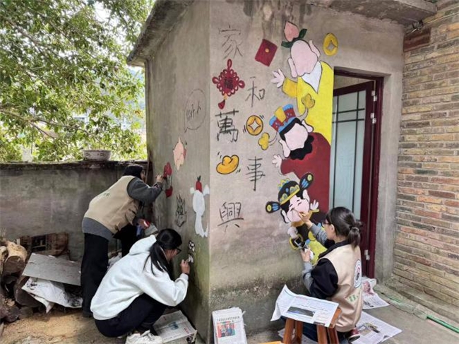 实践队队员以墙为媒,踊跃投身乡村焕新行动,将科技兴农的智慧与乡土温情深度融合,绘就乡村振兴新画卷。 菜园围墙上,“科技种进画里”实践队借科技特派员的专业眼光,把现代农业理念融入墙绘:拔萝卜的小兔周身蓝色光点闪烁,似汗水更如科技赋能;鲜绿菜叶搭配生态种养图,传递出“绿色种植”的坚定信念。 村委会的边角空间也被创意点亮,卫生间墙面绘就“家和万事兴”的温馨景致;窗边翠竹旁,软萌的“青青节节西小竹”探头而出,既展现“竹科技·绿产业”理念,又成为游客惊喜打卡的趣味彩蛋。