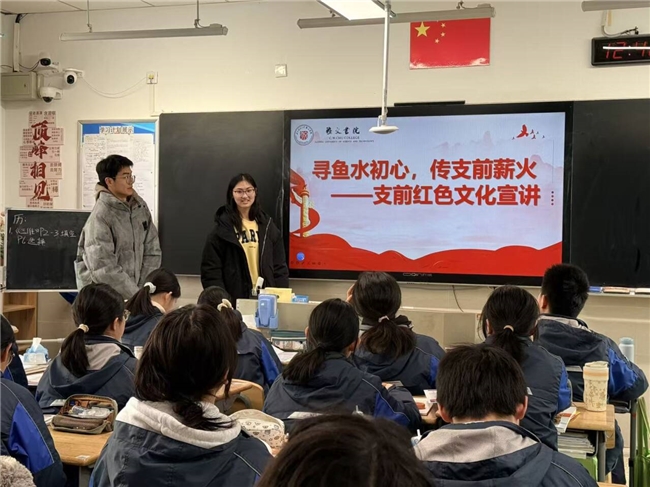 除实地调研外,实践团成员同步返回各自高中母校,开展支前红色文化主题宣讲活动。宣讲中,成员们结合调研成果,用生动案例与影像资料,向同学们讲述“人民力量”的深刻内涵。“以前只在课本里学过淮海战役,今天才知道家乡百姓用小推车推出胜利的细节。”听完宣讲后,一名高二学生表示,这些身边的红色故事让自己对“人民就是江山”有了更真切的理解。实践团成员则表示,返回母校宣讲不仅是知识输出,更是一次自我教育,在与同学们的交流中,对红色文化的当代价值有了更深感悟。