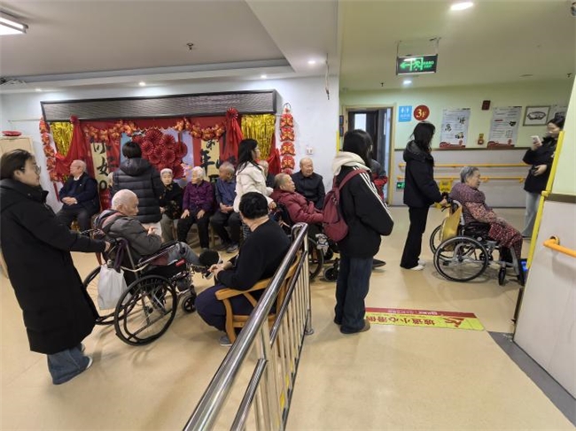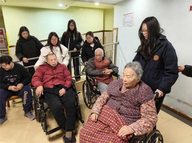 活动接近尾声时,成员们来到坐轮椅的老人身边,小心地扶住轮椅扶手,缓缓推着老人返回休息区。遇到走廊转弯、坡道台阶时,都会先停下确认路况,再稳稳地调整方向。