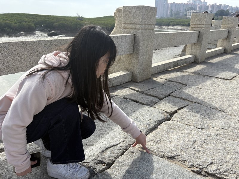 驻足泉州洛阳桥,实践队踏访这座千年古桥的历史遗存。队员们重温蔡襄治桥事迹,研习筏形基础、种蛎固基等古代造桥技艺,透过石塔与碑刻的斑驳印记,遥想当年“市井十洲人”的开放盛景,感悟福建作为海丝起点所承载的文明对话与历史厚度。