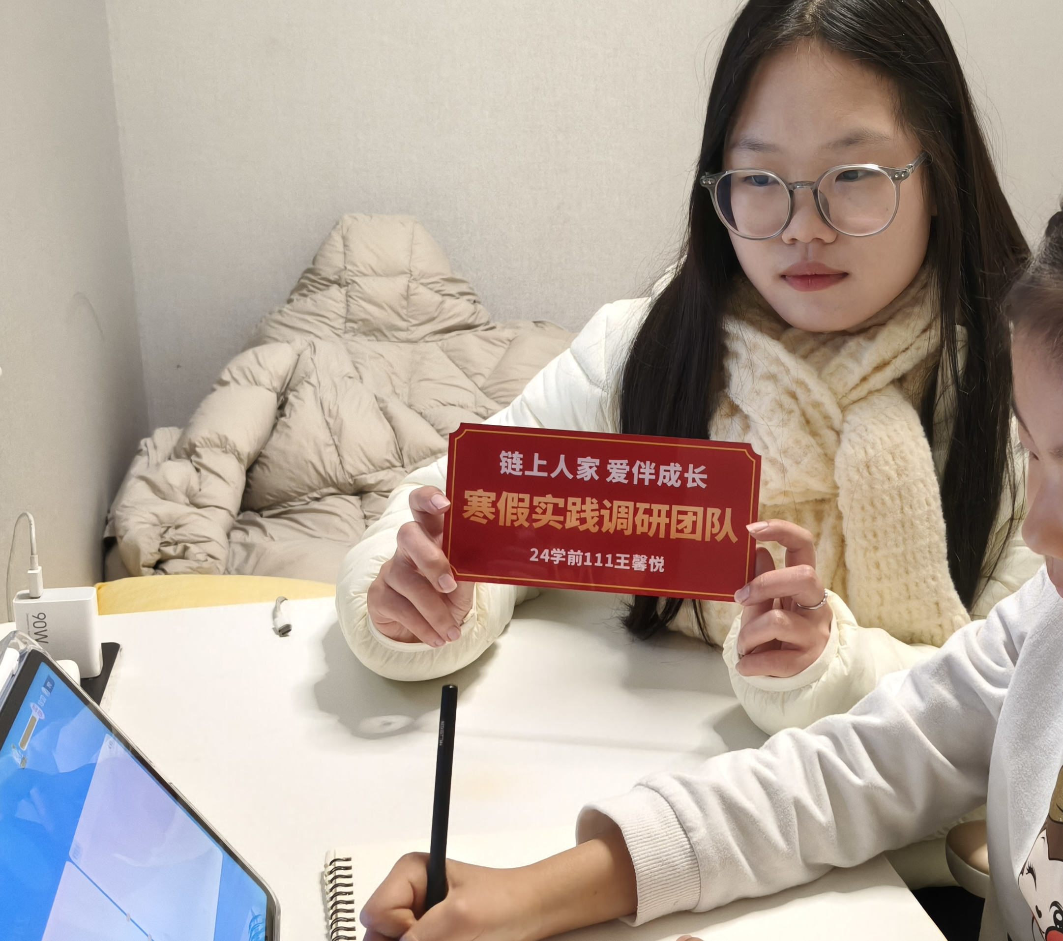 调研之余,团队充分发挥学前教育专业优势,开展寒假公益课堂,为劳动者子女提供作业辅导与兴趣活动。在临时布置的课堂里,孩子们画画、做手工、听故事,脸上露出了久违的笑容。一位孩子拉着志愿者的手问:“姐姐,你们明天还来吗?”这一幕让团队成员深刻感受到陪伴的意义。